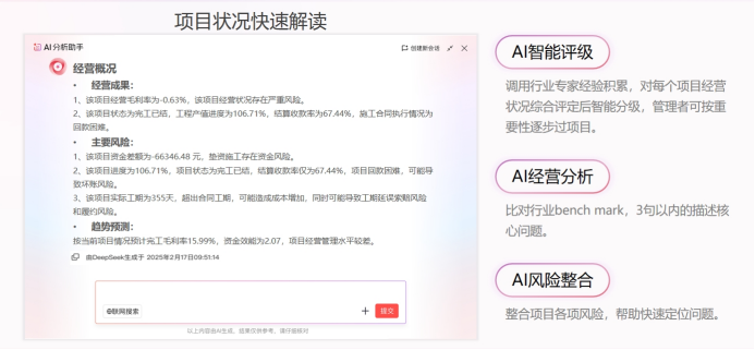 紅圈AI系列智能產(chǎn)品中的項(xiàng)目360°AI解讀,通過整合全維經(jīng)營指標(biāo),一鍵生成項(xiàng)目全景作戰(zhàn)圖,讓復(fù)雜數(shù)據(jù)轉(zhuǎn)化為清晰決策語言。該功能能夠?qū)?xiàng)目經(jīng)營狀況進(jìn)行智能評(píng)級(jí),并整合各項(xiàng)風(fēng)險(xiǎn),幫助管理者快速定位問題。通過結(jié)構(gòu)化呈現(xiàn)項(xiàng)目關(guān)鍵信息、收支分析、資金分析和成本構(gòu)成等數(shù)據(jù),項(xiàng)目360°AI解讀使項(xiàng)目進(jìn)度監(jiān)控更加精準(zhǔn)高效。這種透明化的進(jìn)度跟蹤,不僅提高了項(xiàng)目執(zhí)行效率,也降低了因延期導(dǎo)致的額外成本。