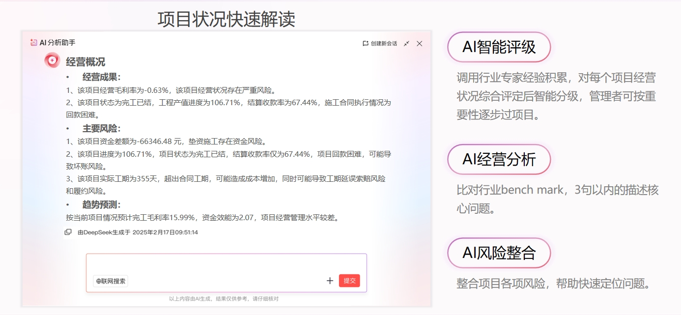 紅圈推出的紅圈AI系列產(chǎn)品中的項(xiàng)目360°AI解讀,能把項(xiàng)目上的資金、成本、合同、付款這些數(shù)據(jù)全都整合在一起,一鍵生成一張項(xiàng)目全景作戰(zhàn)圖。