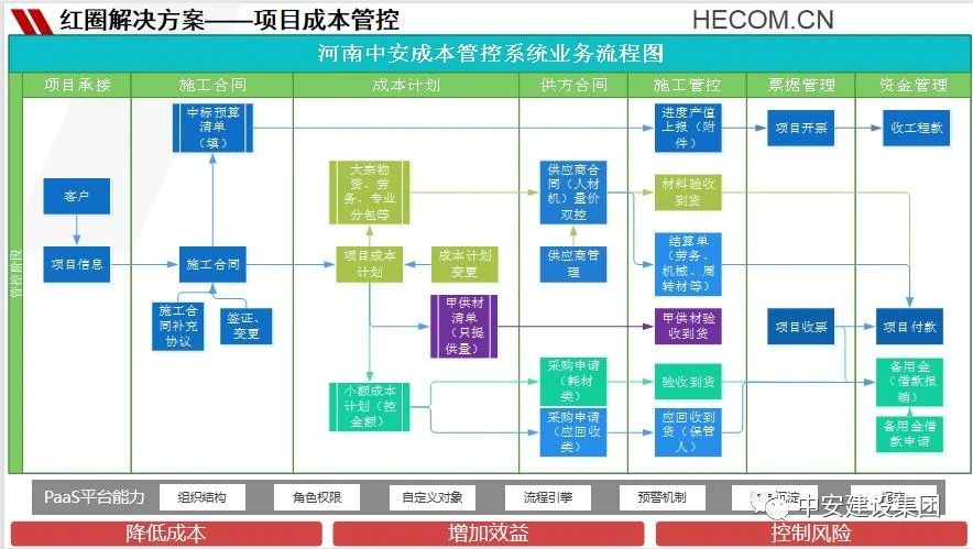在集團公司領(lǐng)導(dǎo)班子的指導(dǎo)下,成本管理中心制定了詳細的工作方案,設(shè)計了60余張成本數(shù)據(jù)表格。而紅圈專業(yè)實施老師也進行了兩次系統(tǒng)調(diào)研,用兩周時間將60余張報表拆解合并成30余個業(yè)務(wù)管控點,并結(jié)合管控業(yè)務(wù)流程圖進行功能匹配,設(shè)計了《中安集團成本管控系統(tǒng)實施計劃表》,涵蓋了往來單位管理、施工合同管理、成本核算管理、成本合同管理、成本結(jié)算管理、項目資金收支管理等項目核心業(yè)務(wù),并且細化了成本管理流程中各個系統(tǒng)責(zé)任人的工作職責(zé)。