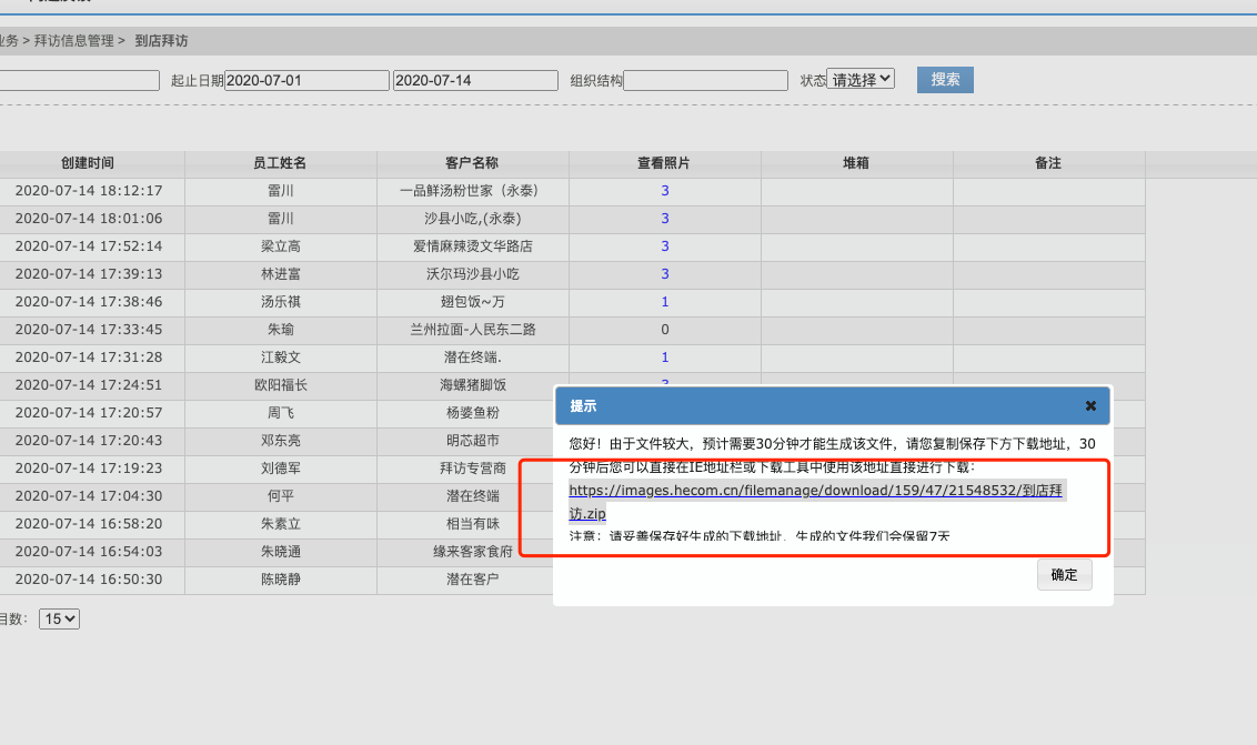 帶圖片數(shù)據(jù)可能會比較大,中等企業(yè)(500人以下)一個月驗證生成壓縮包文件大小有幾百M左右(主要是圖片太多占用空間),點擊導(dǎo)出以后記錄生成的下載鏈接一般15分鐘左右后可以開始下載,如果下載不成功說明文件還沒有生成完(數(shù)據(jù)庫查詢完數(shù)據(jù)再寫入Excel文件,包括寫入圖片,會比較耗時)。