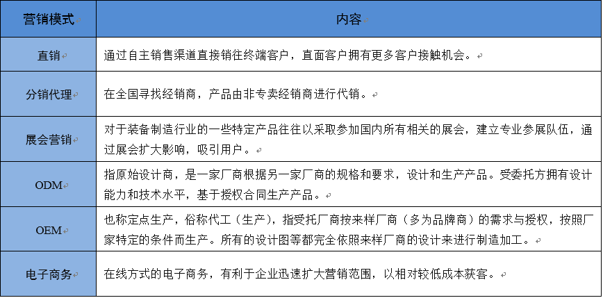 裝備制造業(yè)中由于子行業(yè)眾多,不同子行業(yè)經(jīng)營銷售模式不完全相同,營銷側(cè)重點(diǎn)也有所不同。如汽車制造中的汽車整車營銷模式側(cè)重于經(jīng)銷、專賣等模式,而諸如大型通用設(shè)備、電氣設(shè)備則側(cè)重于展會營銷、招投標(biāo)等模式;在電子設(shè)備中OEM、ODM模式則較為普遍。