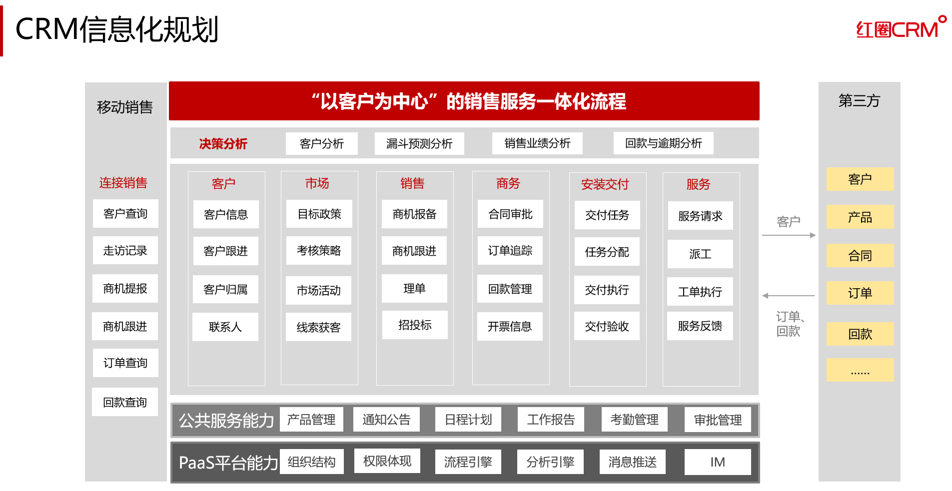 售后服務(wù)等業(yè)務(wù)環(huán)節(jié)都可能會有產(chǎn)品設(shè)計與工藝方案的調(diào)整,企業(yè)的業(yè)務(wù)模式具有明顯的多元化、個性化和碎片化特征,制造業(yè)企業(yè)必然面臨商業(yè)模式和管理模式雙重挑戰(zhàn)。為打通與改善企業(yè)從市場營銷、銷售、研發(fā)、采購、制造到客戶服務(wù)等核心業(yè)務(wù)環(huán)節(jié),借助紅圈CRM打造統(tǒng)一客戶交互平臺,提升管理質(zhì)效,為客戶創(chuàng)造更大的價值。